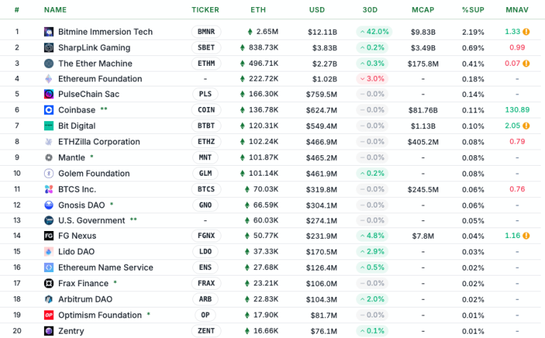 Data from the Strategic ETH Reserve shows that 67 entities, including BitMine and SharpLink, collectively hold about 5.49 million ETH (roughly $25 billion), or 4.5% of the total supply.