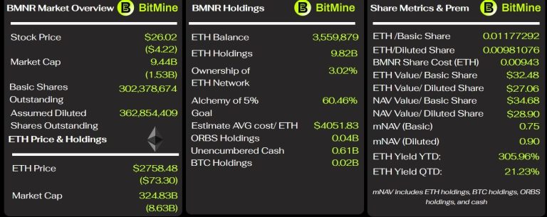 According to BitMineTracker, BitMine’s basic mNAV now sits at 0.75, with its diluted mNAV at 0.90. These figures signal that the market values the firm at a steep discount to the crypto it holds.