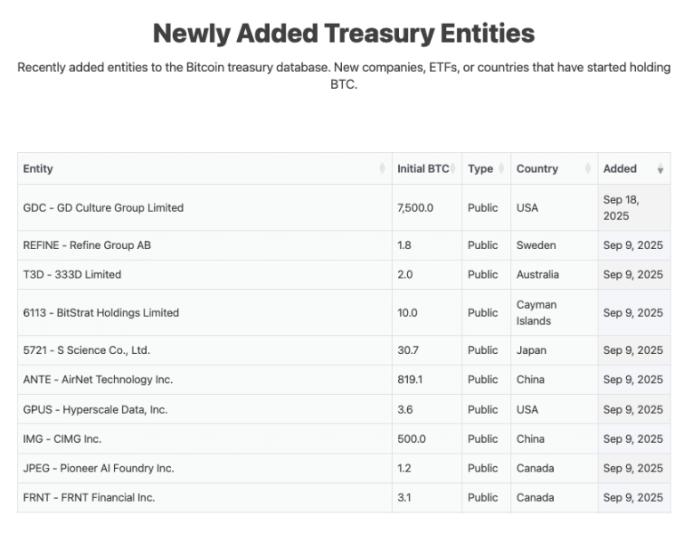 That parade has not shown up for two months. According to BitBo’s treasuries tracker, the last fresh company to join the BTC-on-balance-sheet club was GD Culture Group on September 18. Since then, it’s been nothing new, and the “new entities” table just sits there with that same date at the top.