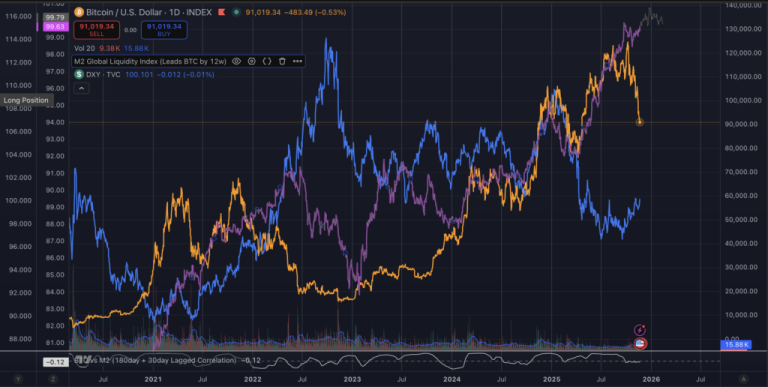 In the post-peak slice through Nov. 20, the sign flips for liquidity, with correlations around −0.49 for both M2 series, while the inverse link to the dollar remains near −0.60. That pattern matches the visual overlay traders watch on charts.