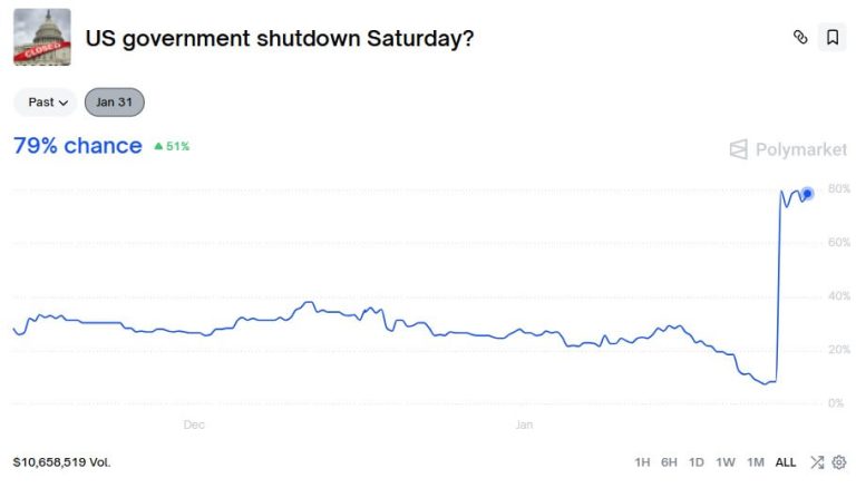 Shutdown contracts on prediction platforms like Polymarket have swung to as high as 80% for a shutdown by Jan. 31. The market has drawn nearly $11 million in bets as of press time.