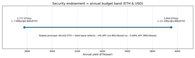 Even conservative validator economics imply meaningful annual capacity: at roughly 4% APY without MEV-Boost or 5.69% with it, 69,420 ETH generates approximately 2,777 to 3,950 ETH per year before operational costs. At $2,800 per ETH, that translates to roughly $7.8 million to $11.1 million annually.